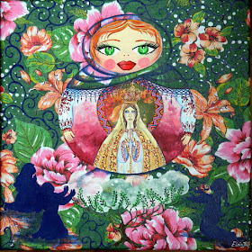 Sobre meu olhar artístico, incorporei as imagens sacras em vestes eslavas no interior das matryoszkas.